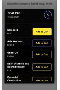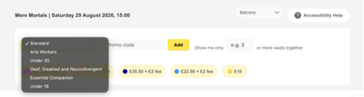 A: £10 Give it a Go Tickets are available to anyone who might benefit from them. Try something new for less. £10 tickets are yellow on the seat map. Navigate to ‘Standard’ on the drop-down menu and click the yellow £10 to view the seats.