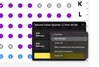 A: On desktop, you can find this information on the top left of the seatmap. You can also select concession prices in the ‘Selected Tickets’ box on the bottom right of the seatmap. You may have to scroll down your page to find it. Click the drop down on your selected seat to see the different concessions available.