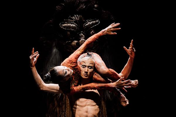 Before the show even started there was heavy use of Eastern Asia influences which includes a Buddhist monk (portrayed by Xiaofan Feng) slowly carrying a crate of wooden Chinese characters, placing them steadily in an ever changing circle as a group of women in leotards and halo like headpieces sat inside that circle doing what appeared to be meditation.