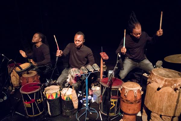 The stories are punctuated by energetic dance numbers, with a soundtrack of live percussion from a trio of musicians.