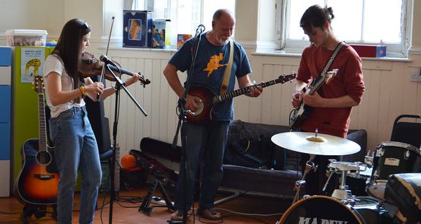 On Friday 21 June, Garry Finlayson (banjo/banjax) and Laura Wilkie (violin) visited the Canongate Youth Music Café and participated in an Open Mic session which saw the Shooglenifty musicians performing alongside young musicians from the youth group. Garry and Laura spoke to the young musicians about their own musical backgrounds and influences as well as the band’s recording projects with Dhun Dhora and Tanxugueiras.