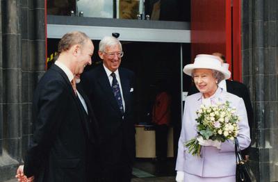 Her Majesty Queen Elizabeth II attending the official opening of The Hub, the home of the Edinburgh International Festival, with Administrative Director Nick Dodds and Deputy Chairman Sir John Shaw in 1999.