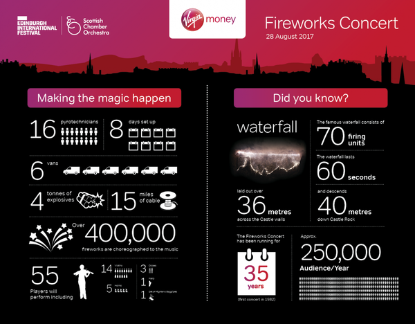 The Virgin Money Fireworks Concert will again bring the festival season to a close in style with a stunning display of over 400,000 fireworks choreographed to live orchestral music set against the spectacular backdrop of Edinburgh Castle This year’s concert with the Scottish Chamber Orchestra includes an additional programme of music with Scottish folk singer Karen Matheson.